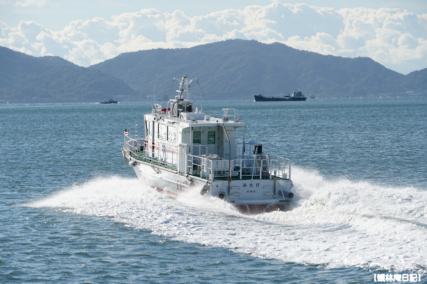 小型船はかなり速くてすぐに距離は縮まり、激しく波を立てながら突進してくる姿になりました。それは幹線道路で違反車を追う警察車両を優に上回る迫力でした。自分事のように不安を感じた私は、警察に追われる立場でないはずと言い聞かせた後、この船に逃亡中の殺人犯でも乗っているのか、あるいは某国の工作員が紛れていることを警察がつかんだのか、などと突飛なことを考えました。もし南西諸島近海で同じような状況になったらC国海警局による不当な拿捕を本気で心配するでしょう。しかし、違いました。小型船は出動中の救急艇でした。後で調べたところ、笠岡地区消防組合が運用する救急艇「みたけ」とわかりました。